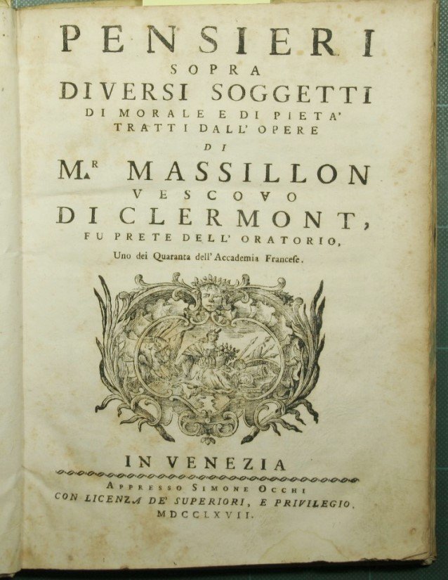 Tratti dall'opere di M.r Massillon Vescovo di Clermont, fu prete dell'Oratorio, uno dei Quaranta dell'Accademia Francese - in 8° - pp.VIII + 155 - Pergamena - Incisione al frontespizio - Testo su due colonne - Piccole mancanze alle sguardie, fioriture e macchie in diverse pp.