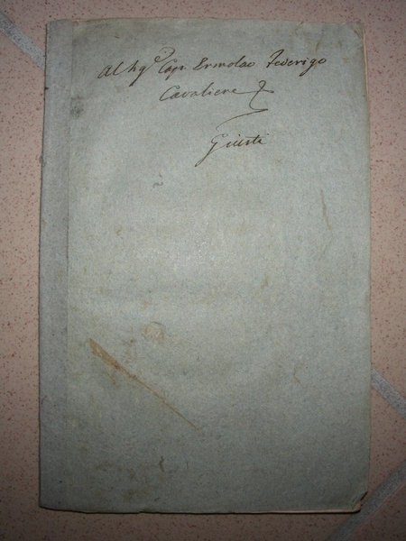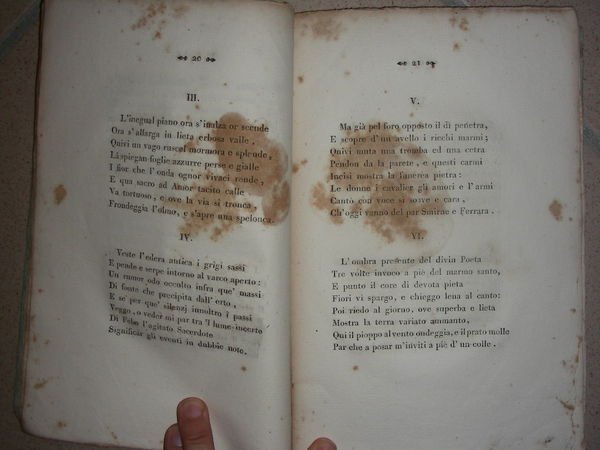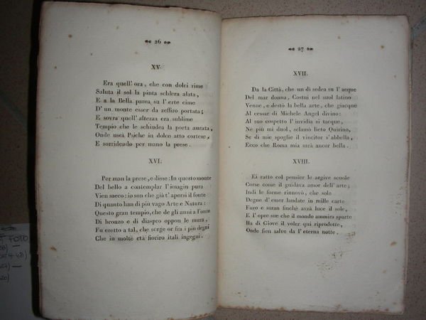 in-8, pp. 62, leg. carta azzurra coeva. Raccolta di versi di Paolo Costa e del Marchese di Montone. Copia inviata "Al Capitano Ermolao Federigo" (come da dedica mss sulla cop. ant.). Precedono le poesie Notizie storiche di Pietro Giordani al Sig. Cavaliere Sen. Antonio Canova. Legg. macchie su 3 pagine. [320]