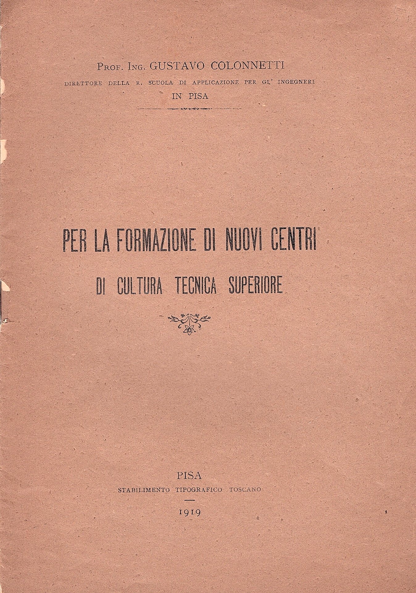 In-8° (24x16 cm) pp. 12, brossura editoriale spillata marrone con titoli nero al piatto anteriore. Lievi difetti al dorso (minime mancanze) ma più che buon esemplare. Non comune edizione originale di questa memoria del Colonnetti in quel momento Direttore dela R. Scuola di Applicazione per gl' ingegneri in Pisa.