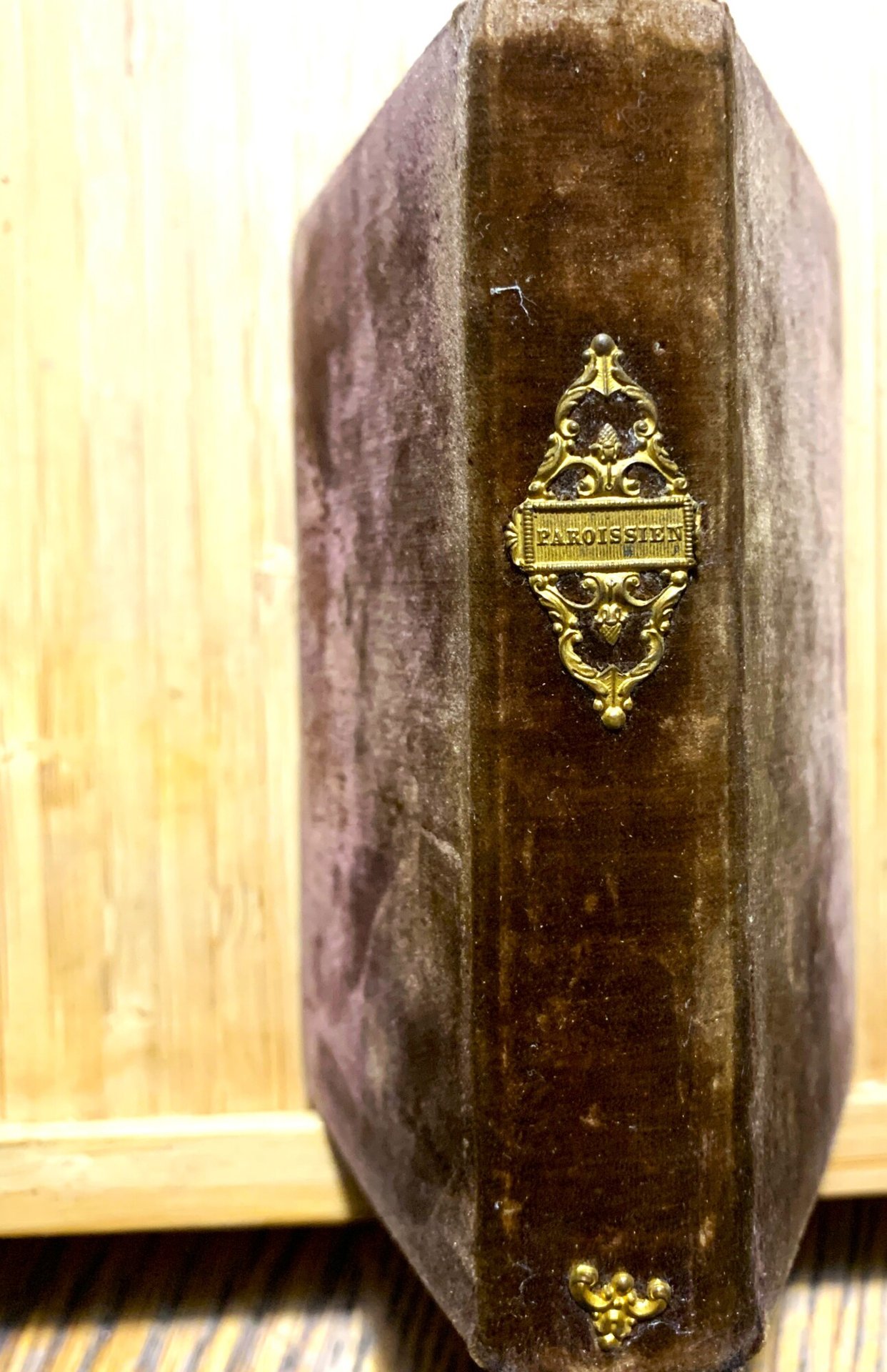 s.d.. Testi delle preghiere in latino e francese. XXIV/ (10)+384+(6) con tagli dorati/ rilegatura rifinita in velluto marrone con titolo in placca metallica dorata e ornata al dorso. Al piede del dorso, un'altra piccola placca dorata ornata. Con capilettera e ornati in nero e con incisioni in nero f.t., protette con carta velina. Sguardie in carta perlata. Stato buono (usura della copertina, in particolare nei canaletti - pagine lievemente brunite e con piccole fioriture). Table: Prières du matin (Commandemens de Dieu - Commandemens de l'Église - Litanie du saint nom de Jésus) - Prières du soir (Litanies de la sainte Vierge) - Ordinaire de la Messe . Prières avant la Confession - Prières après la Confession - Prières avant la Communion - Messe de Communion - Prières après la Communion - Renouvellement des Voeux du Baptême - Prières er Actes pour la Confirmation (Prières avant la Confirmation - Prières après la Confirmation) - Les sept Psaumes de la Pénitence - Litanies des Saints - Les Vêpres du Dimanche - Les Complies du Dimanche (Autiennes à la sainte Vierge) - Prose à la Vierge ("Stabat Mater") - Messe de mariage - Le jour de Noël - Le jour de Pâques - le jour de l'Ascension - Le de la Pentecôte (Veni, Creator - Veni, Sancte Spiritus) - La fête du Saint-Sacrement (Ecce panis Angelorum - Pange, lingua - Sacris solemnii - Verbum - O salutaris Hostia - Adoro te supplex - O sacrum convivium - Ave, verum corpus - Prière au Saint-Sacrement ("Adoremus")) - Cantiquye d'Action de Grâces ("Te Deum") - La fête du sacré coeur de Jésus - La fête de saint Vincent de Paul - L'Assomption de la sainte Vierge - La fête de tous les Saints - Messe de l'enterrement (Prose "Dies irae") - Prières pendant la Messe.