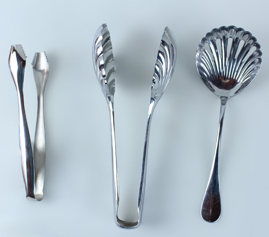 POSATE DA SERVIZIO ACCIAIO INOX: DUE PINZE A CUCCHIAIO + CUCCHIAIO FORATO | Rare and modern books |