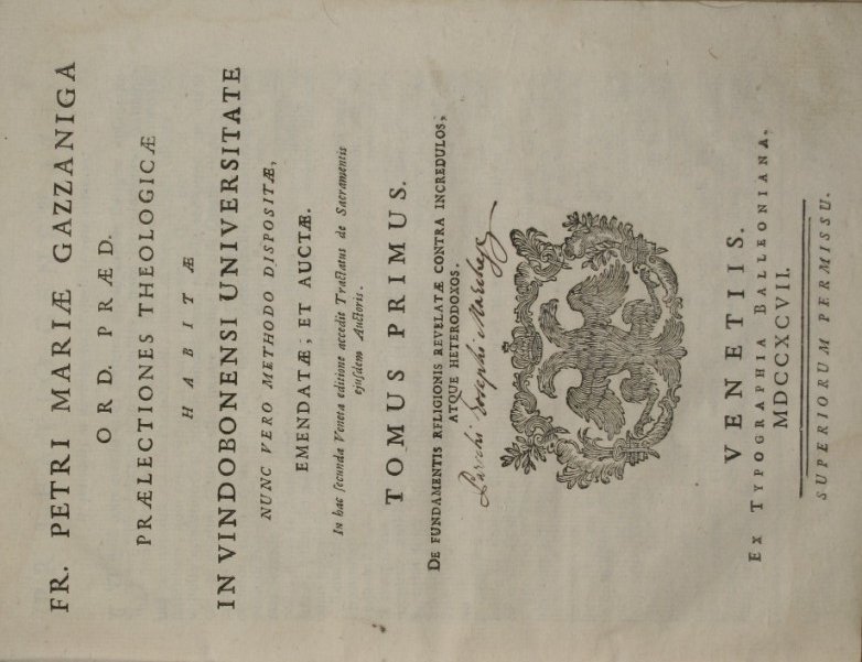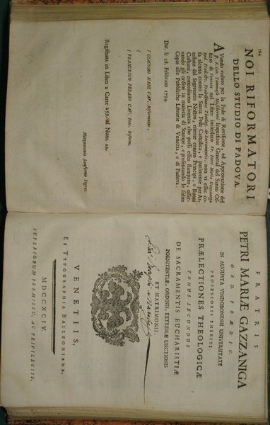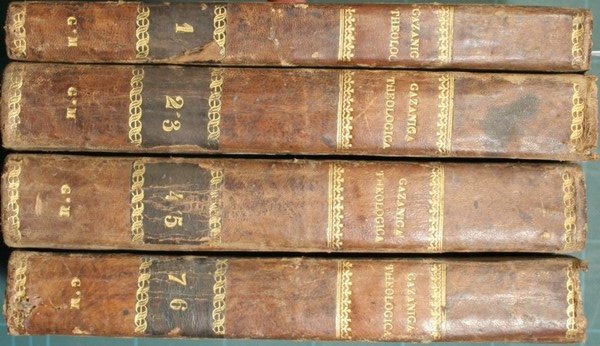 Habitae in Vindobonensi Universitate nunc vero methodo dispositae, emendatae et auctae. In hac fecunda Veneta editione accedit Tractatus de Sacramentis ejusdem Auctoris - in 8° - pp.XII + 282; XII + 240; XII + 228; 240; 300; 268; 219 - Mezza pelle con titolo e fregi in oro al dorso con tasselli - Sette volumi in quattro tomi - Illustrazione in b/n ai frontespizi, testatine, finalini e capilettere decorati - Tagli colorati. Testo su due colonne - Piccoli strappi senza mancanze alle cuffie, note a penna alle sguardie e ai margini di alcune pagine, firme a penna ai frontespizi, rare fioriture in poche pagine - Vol. I: De fundamentis religionis revelatae contra incredulos atque heterodoxos; Vol. II: De Dei essentia et attributis, de visione, de scientia, de voluntate, de praedestinatione et reprobatione; Vol. III: De sanctiss.ma trinitate & de creatione rerum; Vol. IV: De angelis, de opificio sex dierum, ac de homine, variisque eius statibus; Vol. V: De verbi divini incarnatione; Vol. VI: De gratia Dei actuali et habituali; Vol. VII: De actibus humanis et de virtutibus theologicis