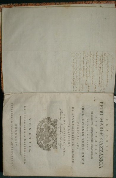 Tomus primus: De sacramentis in genere. De baptismo et de confirmatione; Tomus secundus: De sacramentis eucharistiae, poenitentiae, ordinis, extremae unctionis et matrimonii - in 8° - pp.264; 287 - Mezza pelle con titolo e fregi in oro al dorso - Due volumi in un unico tomo - Fregio al frontespizio, testatine, finalini e capilettere - Testo su due colonne. Tagli colorati - Firma a penna al frontespizio, note a penna ai fogli di guardia e ai margini di pochissime pagine