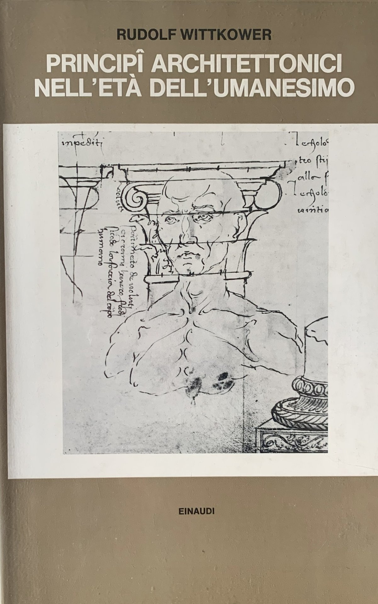 II ed. italiana identica alla precedente: 31 luglio 1971 (I ed. "Architectural Principles in the Age of Humanism", London, Alec Tiranti 1962 - I ed. italiana: Torino, Giulio Einaudi Editore 9 dicembre 1964). Traduzione: Renato Pedio. Biblioteca di storia dell'arte 2. VIII/ XIV+170/ cart./ sovraccoperta illustrata in b/n al primo piatto (Francesco di Giorgio, Studi di proporzioni)/ sovraccoperta in acetato trasparente. Con 119 illustrazioni in b/n in tavole patinate f.t.. Stato buono. Indice: Premessa; R. W. (New York, dicembre 1966) - La chiesa a pianta centrale nel Rinascimento - L'alberti di fronte all'architettura antica - Principî dell'architettura palladiana - Il problema della proporzione armonica in architettura.
