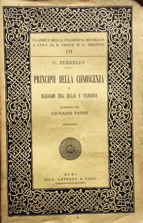 ristampa della raccolta Laterza: febbraio 1923 (Principii della conoscenza: 1710 - Dialoghi tra Hylas e Filonous: 1713 - I ed. Laterza, nella trad. del Papini, della raccolta: 1909). Testi tradotti da Giovanni Papini. Collana di testi e di traduzioni a cura di B. Croce e G. Gentile, Classici della Filosofia Moderna, VII. VIII/ XII+236/ brossura in cartoncino ruvido avorio con titoli in nero e con cornice ornata in nero al primo piatto. Stato buono (lieve usura della copertina ai margini - copertina e pagine brunite - copertina polverosa - quasi interamente intonso). Indice: prefazione del Traduttore - Principii della conoscenza umana (Prefazione dell'Autore - Introduzione - Parte prima) - Dialoghi tra Hylas e Filonous (Prefazione dell'Autore - Dialogo primo - Dialogo secondo - Dialogo terzo)