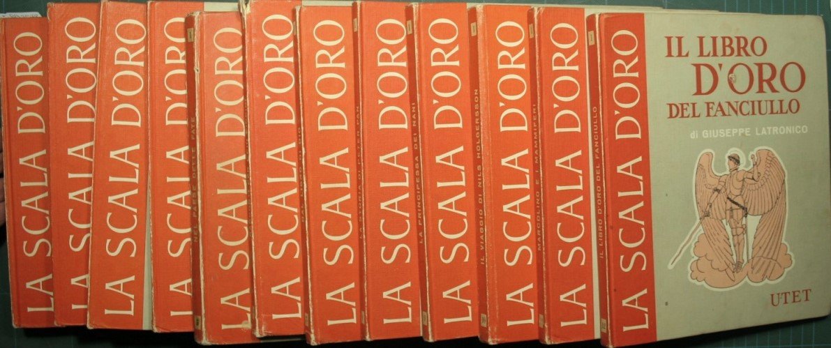 La principessa dei nani; Il viaggio meraviglioso di Nils Holgersson; Marcolino e i mammiferi; Il libro d'oro del fanciullo - Collana La scala d'oro. Biblioteca graduata per i ragazzi. Concepita e diretta da Vincenzo Errante e Fernando Palazzi. Serie Prima per i ragazzi di anni sei - in 8° - pp.65 pp. ca. a volume - Cartonata con copertina illustrata - Dodici volumi in cofanetto - Illustrazioni a colori - Cofanetto rotto, dorso in parte staccato al vol. V