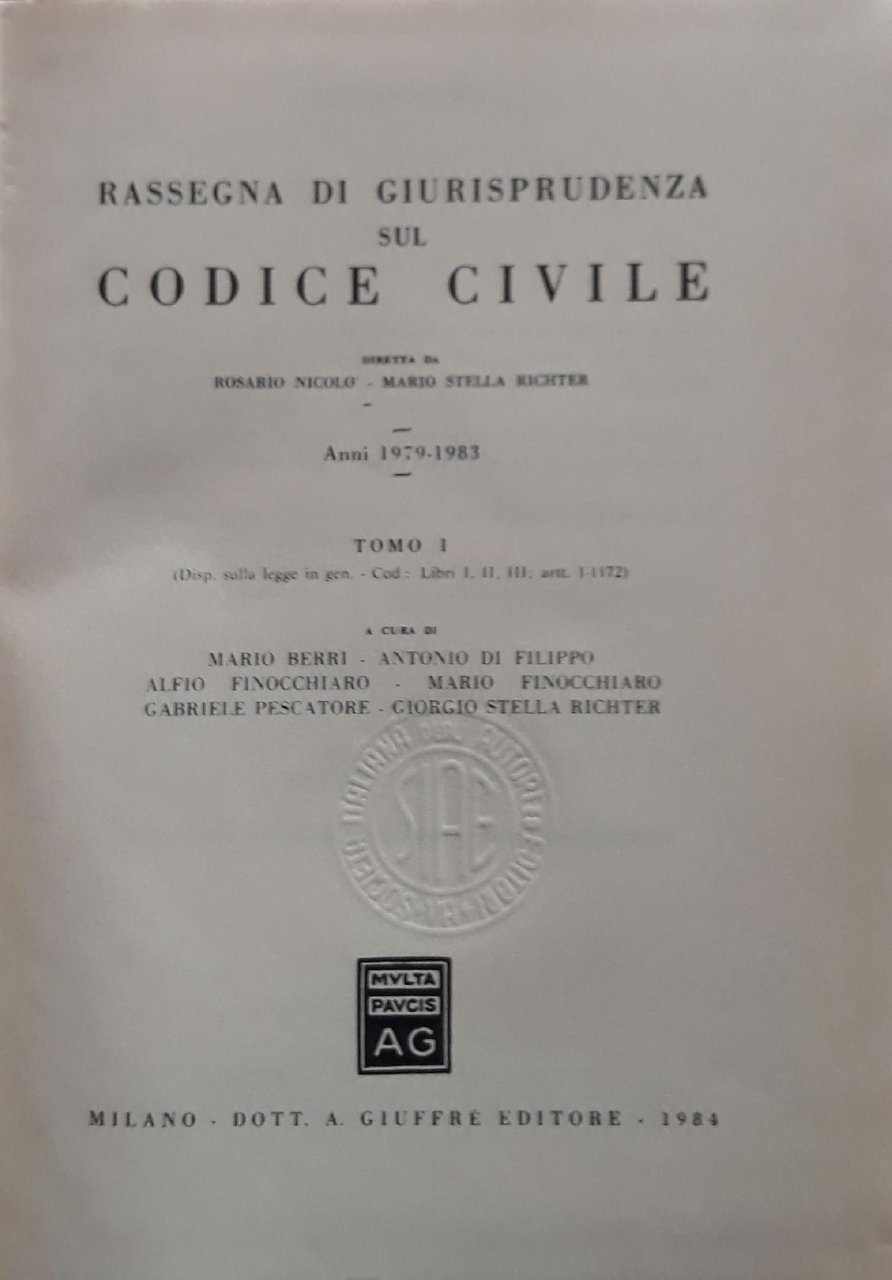Rassegna di giurisprudenza sul codice civile: Tomo 1: Anni 1979-1983 : Disp. sulla legge in gen. Cod.: libri 1,2,3; artt. 1-1172 | Rare and modern books | Rosario Nicolò, Mario Stella Richter, ,Rosario Nicolò, Mario Stella Richter