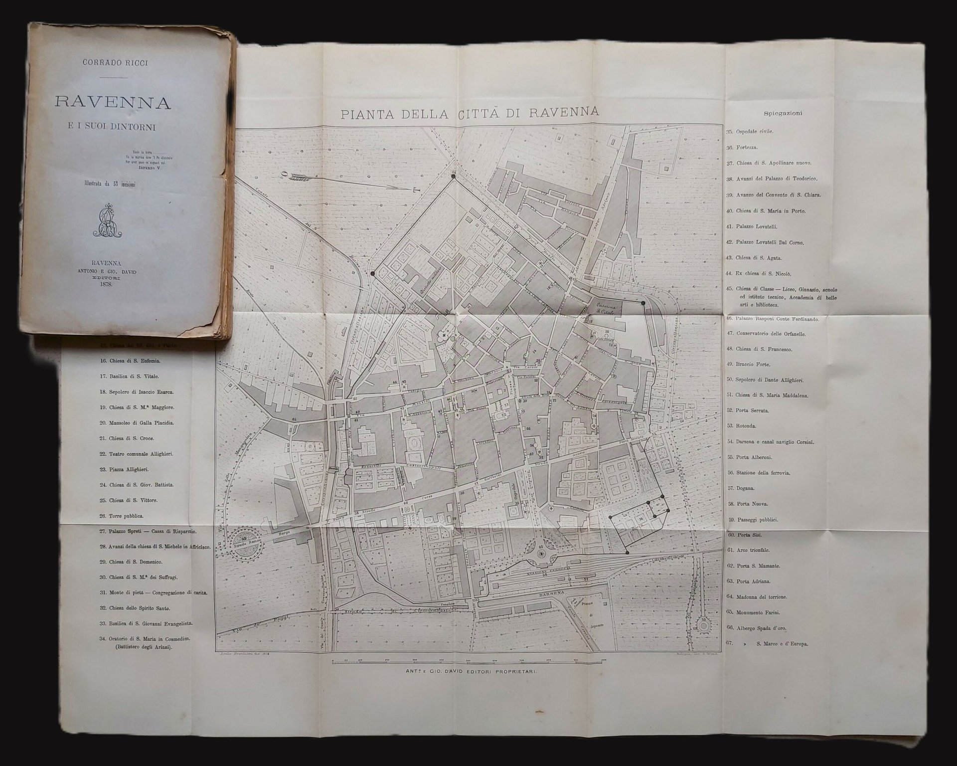 in-8, pp. XIII, (2), 264, bross. edit. Dopo la prefazione tav. con il monumento a Luigi Carlo Farini. Con 53 incis. n.t., anche a piena pagina. Al fine una gr. carta litogr. ripiegata con la pianta della città di Ravenna dis. da Attilio Brandolini nel 1878. Rara guida della città. Rottura al d., ma ottimo esempl., intonso. [563]