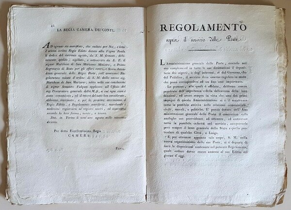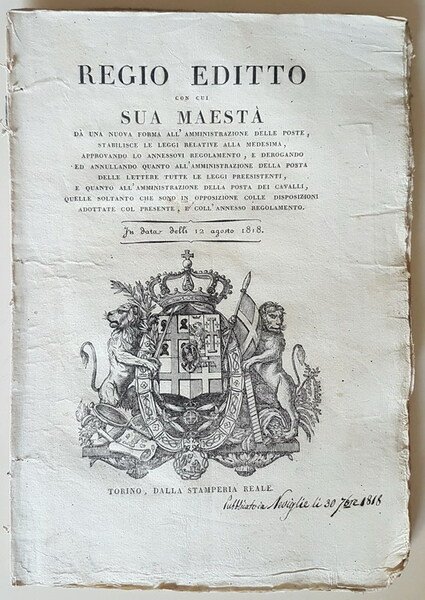 REGIO EDITTO con cui SUA MAESTA' da' una nuova forma all'amministrazione delle Poste, stabilisce le leggi relative alla medesima, approvando lo annessovi regolamento, e derogando ed annullando quanto all'amministrazione della Posta delle Lettere tutte le Leggi preesistenti, e quanto all'amministrazione della Posta dei cavalli, quelle soltanto che sono in opposizione colle disposizioni adottate col presente, e coll'annesso regolamento - In data delli 12 agosto 1818 | Rare and modern books | Vittorio Emanuele Re Di Sardegna, Di Cipro E Di Gerusalemme.