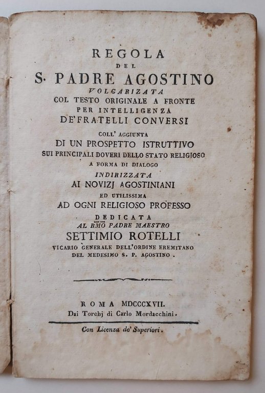 REGOLA DEL S. PADRE AGOSTINO VOLGARIZATA col testo originale a fronte per intelligenza de' fratelli conversi. Coll'aggiunta di un prospetto istruttivo sui principali doveri dello stato religioso a forma di dialogo, indirizzata ai novizj agostiniani ed utilissima ad ogni religioso professo.