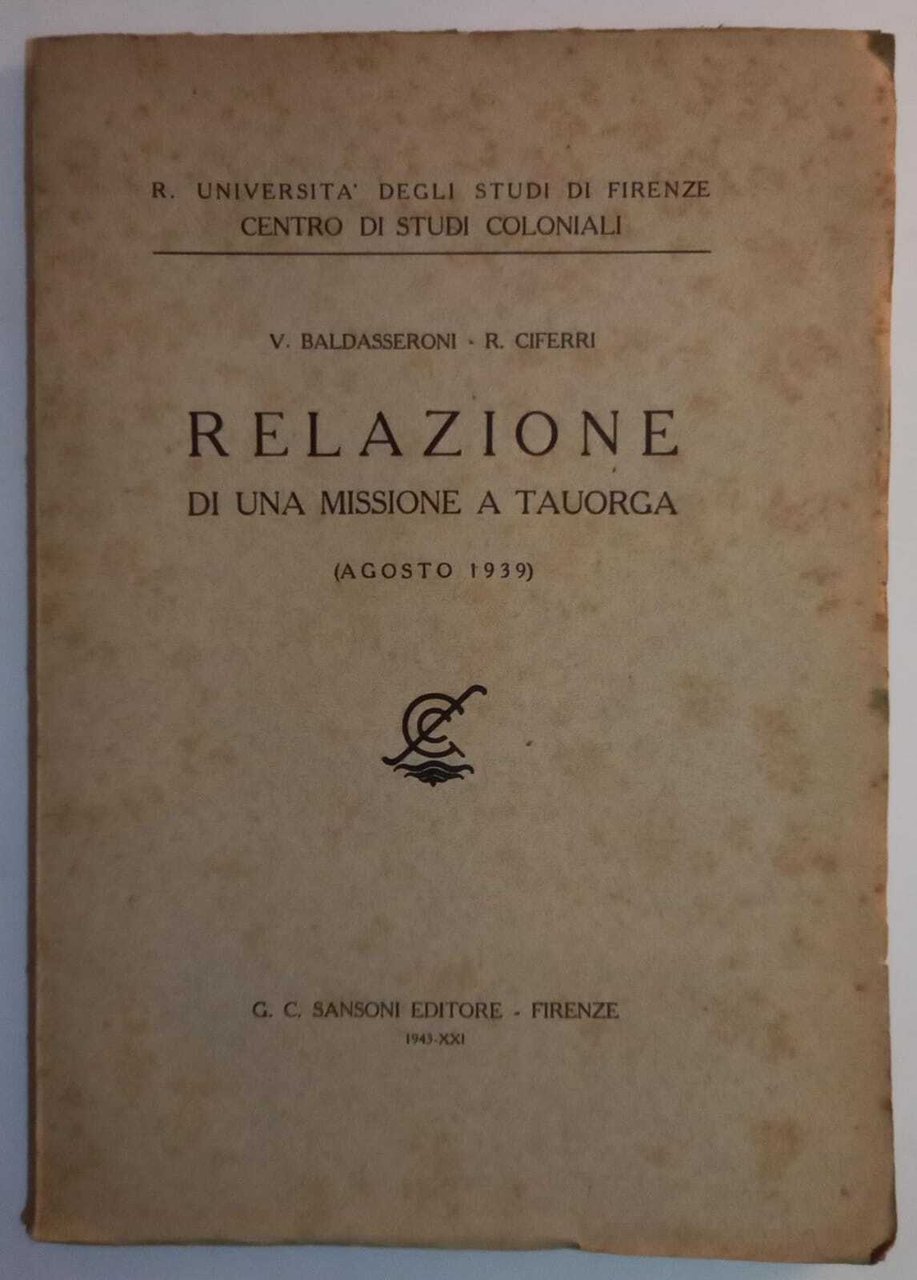Relazione di una missione a Tauorga. R. Università degli studi di Firenze - Centro di Studi Coloniali. N.6 Tavole fuori testo. Brossura editoriale con macchie di fioriture, interno ingiallito ma in buono stato. 55 Buono (Good) .