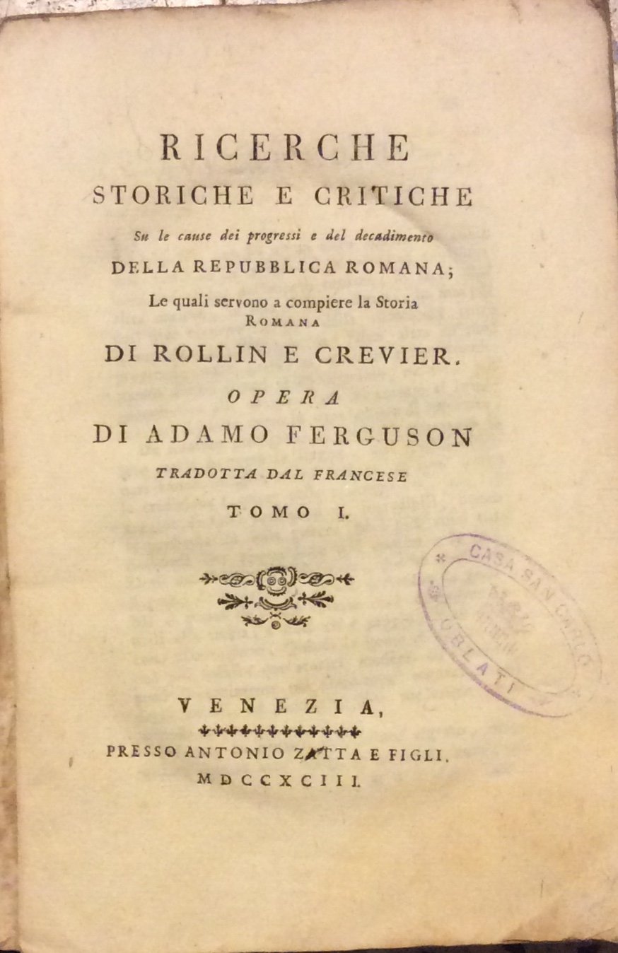 RICERCHE STORICHE E CRITICHE. - Su le cause dei progressi e del decadimento della Repubblica Romana; le quali servono a compiere la Storia romana di Rollin e Crevier. | Rare and modern books | FERGUSON Adamo