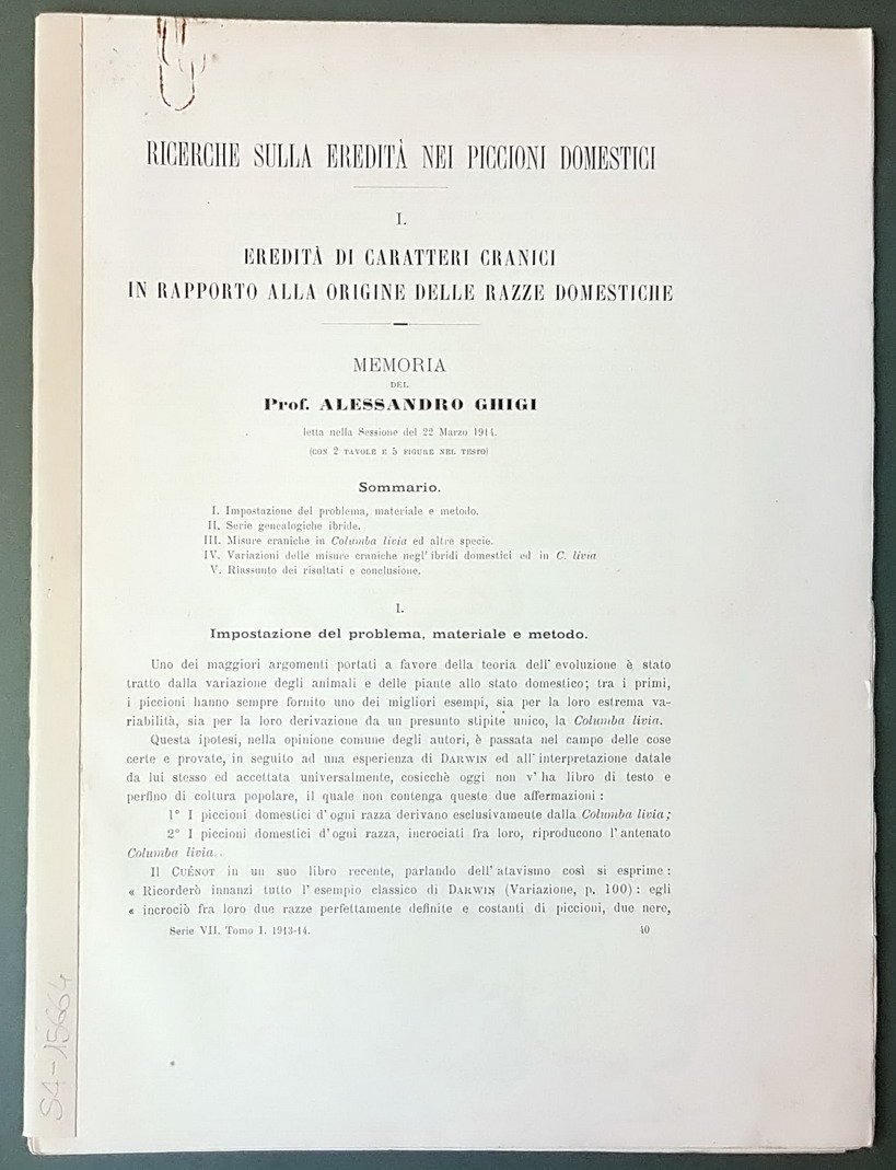 RICERCHE SULLA EREDITA' NEI PICCIONI DOMESTICI - EREDITA' DI CARATTERI CRANICI IN RAPPORTO ALLA ORIGINE DELLE RAZZE DOMESTICHE | Rare and modern books | Memoria Del Prof. Alessandro Ghigi