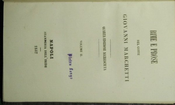 Del conte Giovanni Marchetti - Quarta edizione accresciuta - in 16° - pp.191 - Tela con titolo in oro al dorso - Firma a inchiostro al foglio di guardia