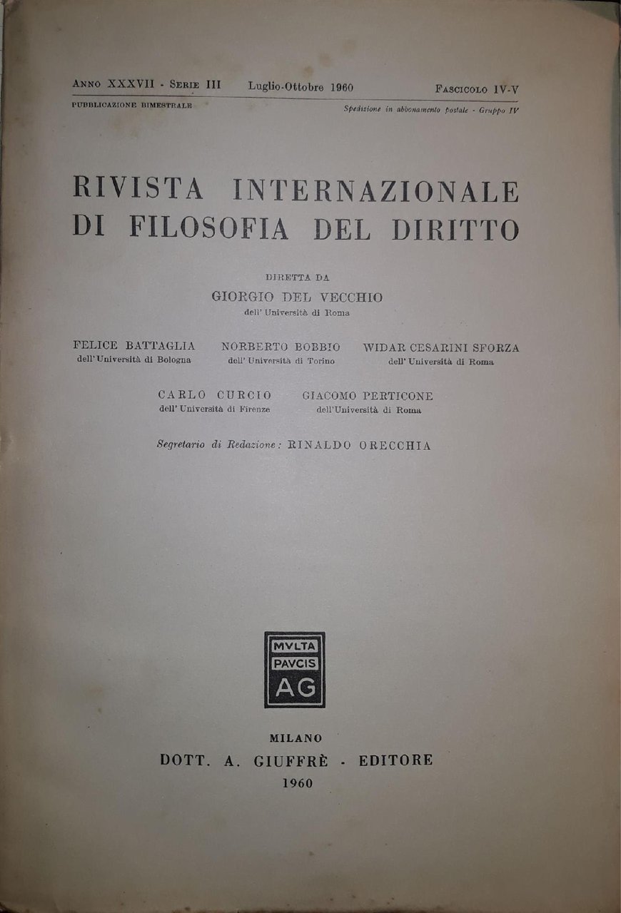 Rivista Internazionale di filosofia del diritto: fascicolo Luglio-ottobre 1960 | Rare and modern books | AA.VV, ,AA.VV