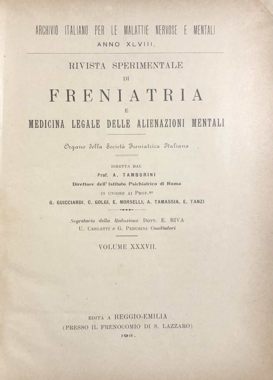 Rivista sperimentale di freniatria e di medicina legale delle alienazioni mentali. Organo della società freniatrica italiana. Vol. XXXVII - Anno 1911 | Rare and modern books | Autori Vari
