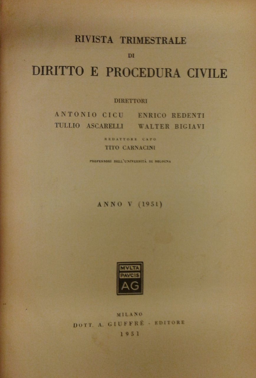 Rivista trimestrale di diritto e procedura civile. Diretta da: Antonio Cicu, Enrico Redenti, Tullio Ascarelli, Walter Bigiavi, Tito Carnacini. Anno V - 1951