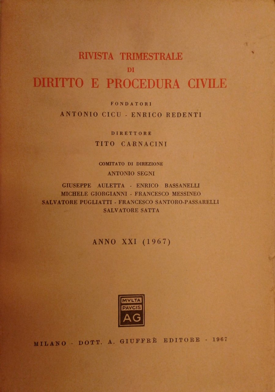 Rivista trimestrale di diritto e procedura civile. Fondata da: A. Cicu e E. Redenti. Diretta da: G. Auletta, E. Bassanelli, T. Carnacini, M. Giorgianni, F. Messineo, S. Pugliatti, F. Santoro Passarelli, S. Satta, A. Segni. Anno XXI - 1967