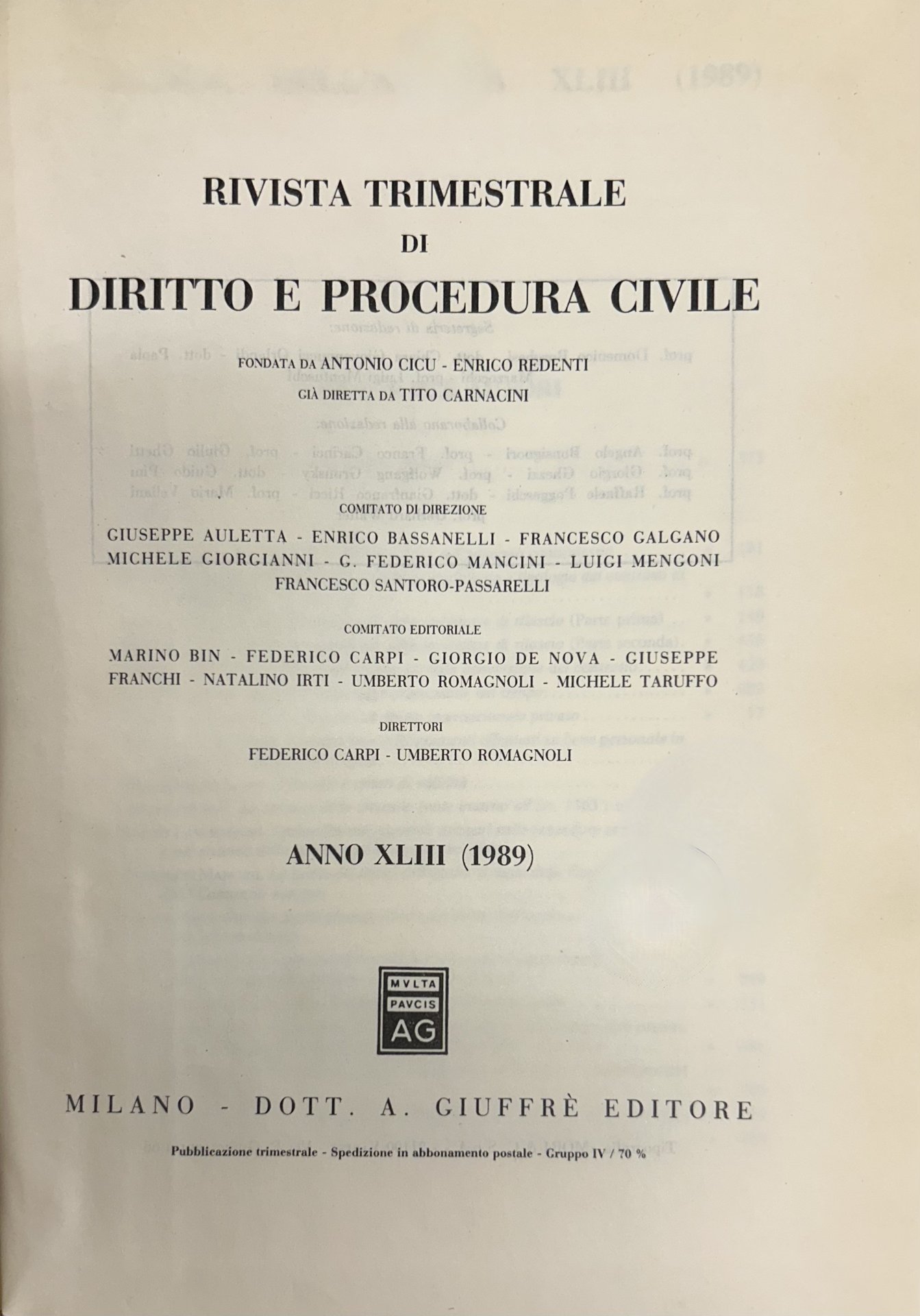 Rivista trimestrale di diritto e procedura civile. Fondata da: A. Cicu, E. Redenti e T. Carnacini. Diretta da: G. Auletta, E Bassanelli, M. Bin, F. Carpi, G. De Nova, G. Franchi, F. Galgano, M. Giorgianni, N. Irti, G.F. Mancini, L. Mengoni, U. Romagnoli, F. Santoro Passarelli, M. Taruffo. Anno XLIII - 1989 | Rare and modern books | Bin M. - Carpi F. - Cassese S. - Cendon P. - Chiarloni S. - Cost, Antino M. - Cottino G. - De Cupis A. - Di Sabato F. - Fazzalari, E. - Forchielli P. - Giorgianni M. - Guastini R. - Irti N. - La, China S. - Lanfranchi L. - Mancini F. - Montesano L. - Pace A. -, Proto Pisani A. - Pugliese G. - Punzi C. - Romagnoli U. - Taruf, Fo M. - Vaccarella R. Et Alii