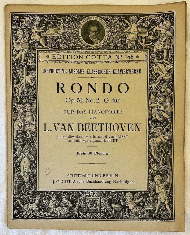 Edizione del 1891 della melodia per pianoforte "Rondo op. 51 n. 2" di Ludwig Van Beethoven. Testo eplicativo tradotto da J. H. Cornell. In buone condizioni. Copertina editoriale in buone condizioni con lievi usure marginali. Legatura editorialmente assente. Pagine in buone condizioni con fioriture. Usure marginali a pag. 7. In folio. cm. 34,5x27. Pp. 13.Edition of 1891 della melodia per pianoforte "Rondo op. 51 n. 2" for piano by Ludwig Van Beethoven. Explicative text translated by J. H. Cornell. In good conditions. Editorial cover in good conditions lightly worn in the extremities. Binding is editoriarly missing. Pages in good conditions with foxing. Wearings in the edges of page 7. In folio. cm. 34,5x27. Pp. 13.