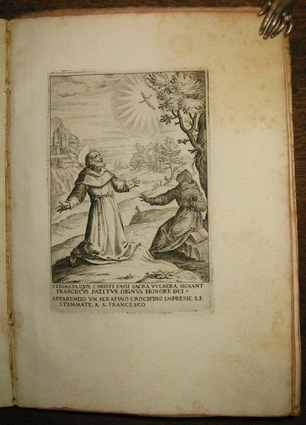 8vo (cm. 19), 1 c.nn. (frontespizio inciso) e 51 tavv. incise su rame, numerate e con didascalia in italiano e latino. Legatura coeva in pergamena floscia (piatti increspati, piccole macchie e alcuni numeri anticamente ms.). Interni leggermente allentati. Fioriture sui margini bianchi di alcune tavole, più intense sulla n. 32. Nel complesso, ottimo esemplare. Opera estremamente rara che raffigura - attraverso le belle incisioni di Francesco Villamena (1564-1624) - gli episodi più rappresentativi della vita del santo di Assisi. La tavola 13 mostra ad esempio l’incontro tra Francesco e il sultano turco avvenuto nel 1219, mentre la tavola 46 il santo che riceve le stimmate dul monte La Verna nel 1224. ICCU censisce esemplari con sole 49 tavole. Br. Libr., p. 278.