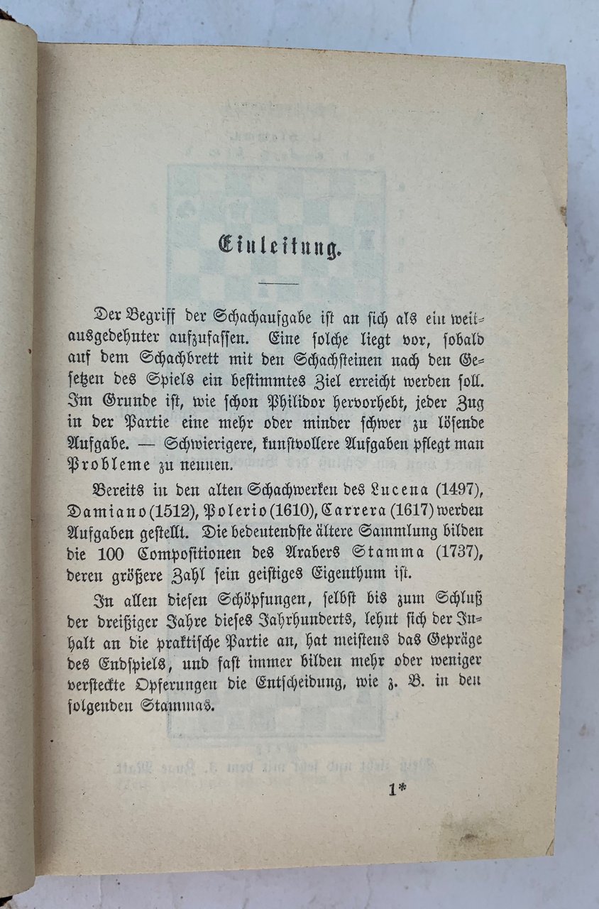 ed. s.d. della prima parte (erster Theil) dell'opera. Testo in tedesco. XXIV grande/(2)+232=234 spruzzate seppia/ rilegatura in mezza pelle nera e piatti in carta goffrata effetto pelle marmorizzata grigio, daino e nero. Mit 62 Kompositionen der Verfasser (62 scacchiere in nero nel testo). Fogli di guardia in carta patinata bianca marmorizzata in rosso giallo e blu. Ex libris illustrato in nero applicato al primo foglio di guardia. Stato buono (usura della copertina a cui, in particolare, manca il dorso - fogli di guardia e pagine brunite - alcuni appunti e segni a matita nelle pagine).