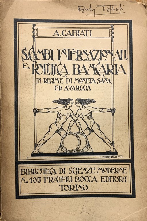 I ed.: "Questo libro, che doveva essere la seconda edizione di un mio lavoro precedente (I), è invece venuto cosa nuoba per la massima parte, sicchè ho creduto opportuno di mutarne anche il titolo. (I) "Principî di Politica Commerciale" (Genova, Stabilimento Grafico Editoriale, 1925)" (incipit della Prefazione dell'A., p. V). Biblioteca di Scienzee Moderne N. 105. VIII/ (2)+XIV+298+(2)/ brossura in carta ruvida avorio con titoli e disegni in nero (copertina incisa di F. Beghelli). Con grafici in nero nel testo. Stato buono (usura della copertina e delle pagine dovute alla qualità della carta che tende a sfaldarsi - copertina e pagine brunite firma di possesso ad inchiostro nero in testa al primo piatto della copertina - allentamento della rilegatura - qualche raro segno a matita). Indice delle materie: Prefazione; Attilio Cabiati (Gennaio 1929) - I costi comparati - Equilibrio interno ed equilibriio internazionale - I mezzi tecnici del trasporto dei capitali e alcuni effetti di essi - Il movimento dei capitali in regime di valuta avariata - Gli ostacoli alla libertà degli scambi internazionali e i loro effetti - I dazi fiscali e la loro incidenza - Il "dumping" e i dazi compensatori - I dazi di ritorsione - Il commercio internazionale in regime di valuta avariata