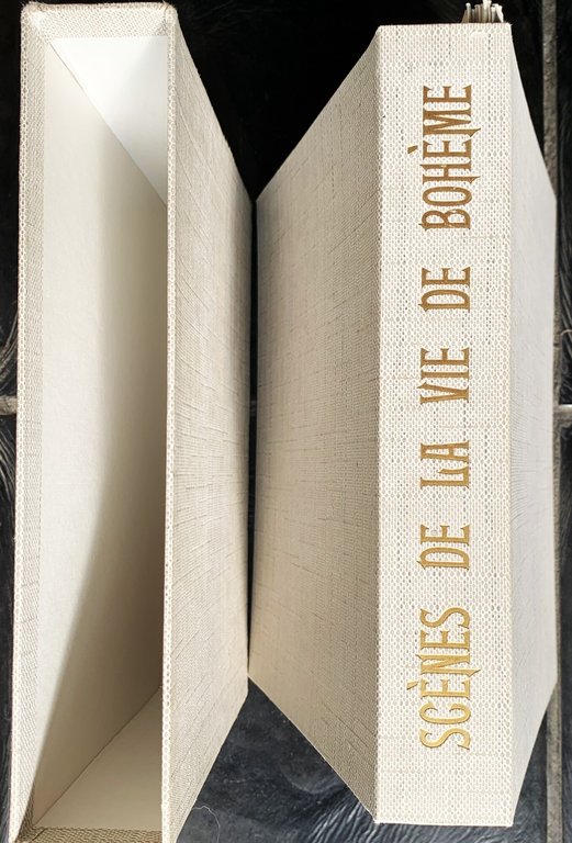 ed. con tiratura limitata 17 novembre 1951 (pubblicate tra il 1847 e il 1849 sulla rivista Le Corsaire e raccolte in volume nel 1851): Il a été tiré de cet ouvrage: 12 ex. sur Annam pur chiffon de Rives enrichis d'un cuivre original gravé de la main de l'Artiste, et d'une suite en noir des pointes sèches, avec remarques, numérotés de 1 à 12; 12 ex. sur Annam pur chiffon de Rives mis en couleurs à la main et contenant une planche originale de la main de l'Artiste, ainsi qu'une suite en noir des pointes sèches, avec remarques, numérotés de 13 à 24; 12 ex. sur Annam pur chiffon de Rives mis en couleurs à la main et contenant un original des couleurs à la main ainsi qu'une suite en noir des pointes sèches, avec remarques, numérotés de 37 à 131; 95 ex. sur Annam pur chiffon de Rives, numérotés de 132 à 226; 770 ex. sur pur chiffon B. F. K. des Papeteries de Rives, numérotés de 227 à 996 (Exemplaire sur pur chiffon B. F. K. des Papeteries de Rives, N. 865). Testo in francese: ersion premiére traduite de l'anglais. VIII/ (8)+312+(4)/ camicia muta in cartoncino liscio avorio/ camicia in cartoncino ruvido avorio con titoli in blu e illustrazione in nero al primo piatto del Bècat/ camicia in cartoncino rifinita in tessuto grigio cerato con titoli dorati al dorso/ cofanetto editoriale muto rifinito in tessuto grigio cerato. Avec 12 plances taille-douce par Manuel Robbe. Con ornati in nero in calce ai capitoli. Stato buono. Table des matières: Comment fut institué le cénacle de la Bohème - Un envoyé de la prvidence - Les amours de Carème - Ali-Adolphe, ou le Turc par nécessité - L'écu de Charlemagne - Mademoiselle Musette - Le flots du Pactole - Ce que couteune pièce de cinq francs - Les violettes du pôle - Le cap des Temp êtes - Un café de la Bohème - Une réception dans la Bohème - La crémaillere - Mademoiselle Mimi - Donec gratus... - Le passage de la Mer Rouge - La toilette des graces - Le manchon de Francine - Les fantasies de Musette - Mimi a des plumes - Romeo et Juliette - Épilogue des amours de Rodolphe et de Mimi - La jeunesse n'a qu'un temps.