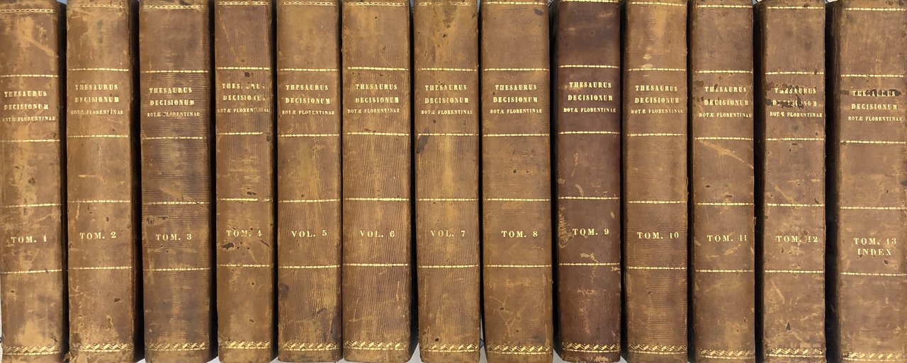 Selectarum Rotae Florentinae decisionum thesaurus ex bibliotheca Johannis Pauli Ombrosi. Vol. I-XII; Vol XIII - Thesaurus decisionum selectarum rotae Florentinae in compendium redactus et ad modum indicis in singulas materias distributus cui praecedit elenchus dictarum decisionum in duodecim volumina compraehensarum ordine cronologico per dioeceses dispositus | Rare and modern books | Granducato Di Toscana - Rota Florentina - Ombrosi Giovanni Paolo, - Ombrosi Johannis Pauli