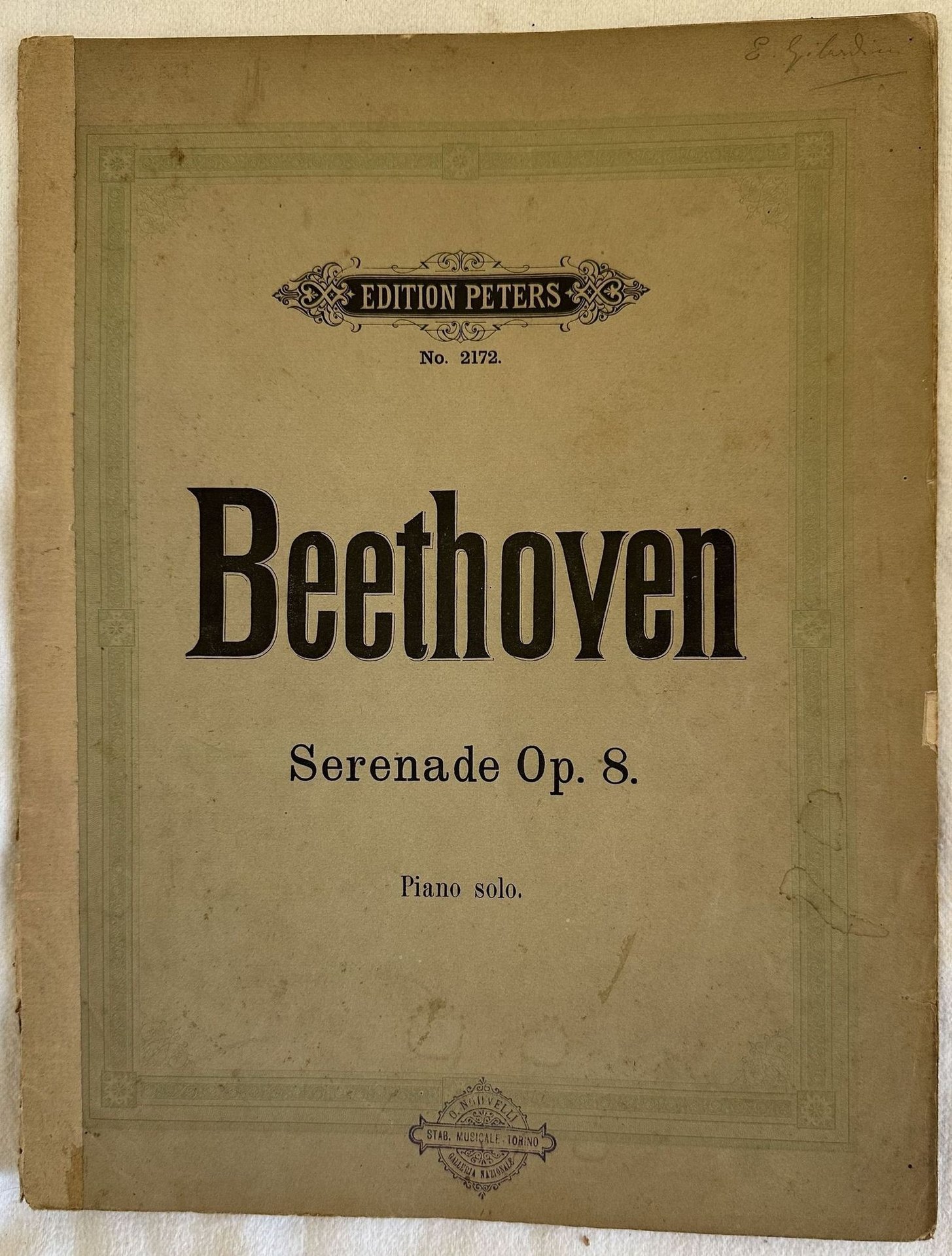 Edizione della fine dell'ottocento della melodia per pianoforte "Serenade op. 8" di Ludwig Van Beethoven riviste da August Horn. In discrete condizioni. Copertina editoriale in discrete condizioni generali con lievi usure ai margini e dorso. Dorso coperto da carta. Legatura quasi assente. Pagine in buone condizioni con fioriture. In folio. cm. 31x24. Pp. 23.Edition of late 19th century of the melody for piano "Serenade op. 8"per pianoforte by Ludwig Van Beethoven reviewed by August Horn. In fair conditions. Editorial cover in fair conditions lightly worn in the extremities. Spine covered by paper. Binding editoriarly missing. Pages in good conditions with foxing. In folio. cm. 31x24. Pp. 23.