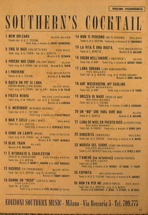 Autori: Testoni G. C., Thorn G., Beretta L., Hoagy Carmichael, Seymour E., Elgos, Biri, Palos M., Larenza J., Robles M., Robles Athala, Reyes Rodriguez J., Pinchi, Cuso Mendoza O., Malgoni G., Bertini U., Sansone Mario F., Gonzalez Josè J., Lilientha - in 8° - pp.25 - Brossura editoriale - Contiene i brani: New Orleans ( slow blues ), Tris di baci ( fox moderato ), Povero mio cuor ( slow ), I proverbi ( fox moderato ), Basta un po di luna ( slow moderato ), Fiesta negra ( bajon candombè ), Il merengue ( merengue ), Mar y cielo ( bolero ), Come un lampo ( cha cha cha ), Blue train ( blues ), E' ritornato il charleston ( fox charleston ), Ricordo ( slow moderato ), Dammi un beso ( cha cha ), Non ti perdono ( bolero ), La vita è unaruota ( fox moderato ), Credo nell'amore ( slow ), Luna cubana ( fox bolero ), Auf Wiedershn my darling ( slow moderato ), Brezza di mare ( bolero mambo ), Un no che vuol dire mai ( slow ), Luna de miel en puerto rico ( bolero mambo ), Sincerità ( bolero ), Musica del cuore ( valzer moderato ), T'amerò se m'amerai ( valzer lento ), Espinta ( bolero mambo ) e Non fa per me ( fox moderato ) - Autori: Testoni G. C., Thorn G., Beretta L., Hoagy Carmichael, Seymour E., Elgos, Biri, Palos M., Larenza J., Robles M., Robles Athala, Reyes Rodriguez J., Pinchi, Cuso Mendoza O., Malgoni G., Bertini U., Sansone Mario F., Gonzalez Josè J., Lilienthal R., Christy Tommy, Iglesias Pepe, Elgos, Dominguez A., Malgoni G., Navarro Pedro, Martin Angel, Cardenas Luis A., Gentile A., Capo Bobby, Brens B., R. Perez y Soto, Wiener H., Crane Cy, Paddy Y., Jimenez N., North G., Carstens N., Segal C., Styger V. e De Waal A. - Partitura per Violino/Fisarmonica, strumenti in sib - Contiene i testi dele canzoni