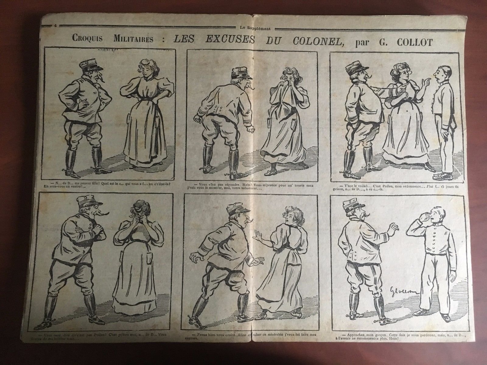LE SUPPLÉMENTStampa originale fine '800 su cartoncino coevopagina centrale di Le SupplémentCROQUIS MILITAIRES: LES EXCUSES DU COLONEL par G. Collotformato stampa 30x40 cmformato con cartoncino 30x40 cm (30 g circa)in ottimo stato come da foto salvo piccolo strappo nel segno di piega del bordo inferioreE22443