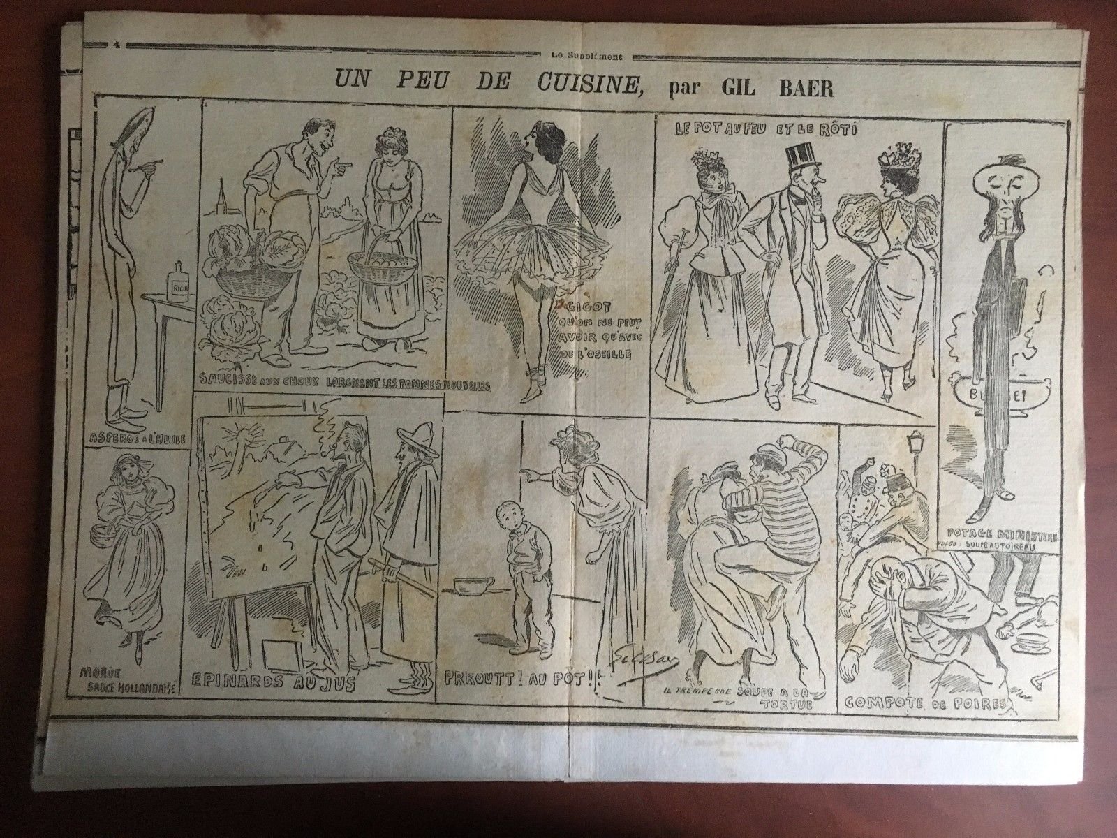 LE SUPPLÉMENTStampa originale fine '800 su cartoncino coevopagina centrale di Le SupplémentUN PEU DE CUISINE par Gil Baerformato stampa 27,5x40 cmformato con cartoncino 30x40 cm (30 g circa)in ottimo stato come da foto salvo strappo nel segno di piega del bordo inferioreE22473
