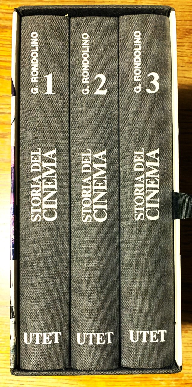 I ed. dell'opera in 3 volumi in-8° grande rilegati in tela nera con titoli in bianco e contenuti in cofanetto editoriale in mezza tela nera con i piatti rifiniti in carta patinata bianca (titoli in nero e bianco e collage fotografico in b/n e a colori relativo ad immagini cinematografiche: ritratti di attori, locandine, scene etc.). Con illustrazioni in b/n e a colori. Stato dell'opera nel complesso buono. Volume primo (pp. XII+466): Introduzione - Archeologia del cinema - Lo spettacolo cinematografico - Griffith e il cinema come arte - Le sccuole europee - La grande stagione del cinema americano - L'avanguardia cinematografica - Il cinema nell'Unione Sovietica); Volume secondo (pp. VIII+488): La grande stagione del cinema muto europeo - Il ccinema americano negli anni di Roosvelt - Il cinema francese degli Anni Trenta - Il realismo socialista - L'Europa verso la guerra - Il neorealismo italiano; Volume terzo (pp. VIII+530): Tradizione e novità in America e in Europa - Il cinema in Oriente e in America Latina - La "nouvelle vague" - Il cinema degli Anni Sessanta - La fine di Hollywood - Il cinema dei Paesi emergenti - Bibliografia - Indice analitico - Fonti iconografiche).