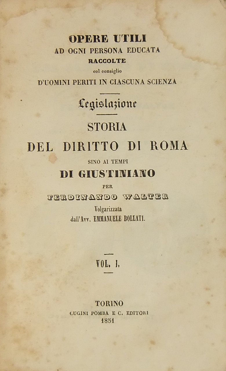 Storia del Diritto di Roma sino ai tempi di Giustiniano . volgarizzata sulla seconda edizione tedesca dall'Avv. Emmanuele Bollati. Vol. I - Diritto pubblico; Vol. II - Fonti e scienza del diritto. Diritto privato. Processura. Diritto penale | Rare and modern books | Walter Ferdinand