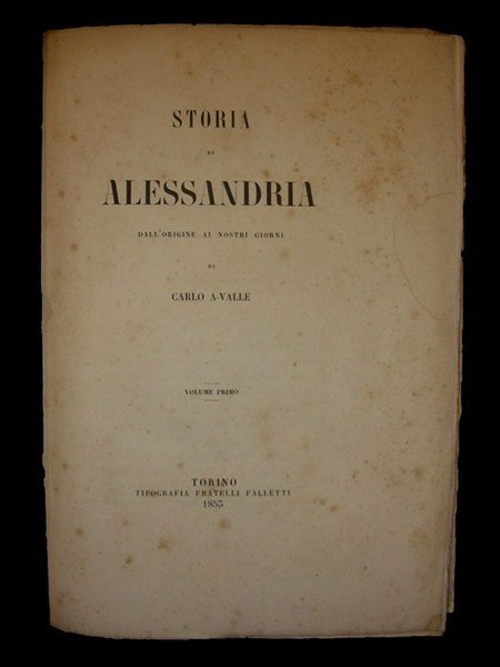 4 voll. in-8, pp. XI, 453; 286; 675; 575, leg. mod. m. pelle con angoli e c. dec. ai piatti, doppio tass. al d. con nervi e fregi oro al d. Importante storia della città dal medioevo al XIX sec. rilegata in 4 voll. con l'ultimo libro dedicato alla descrizione delle principali famiglie e ai più illustri personaggi del luogo. Autore di alcune operette letterarie e teatrali C. A-Valle (1815-1873) fu soprattutto giornalista di satira politica con i vari pseudonimi di Frà Chichibio, Frà Pignatta etc. e collaboratore di alcuni periodici torinesi. Tra le opere maggiori oltre alla Storia del Risorgimento Italiano e alla Storia del Piemonte, anche questa monumentale Storia di Alessandia che gli meritò la cittadinanza onoraria. Con la cop. orig. nel II voll. Manca al Lozzi. [135]