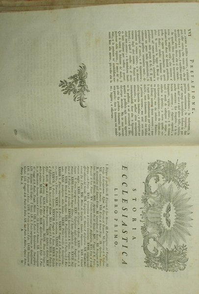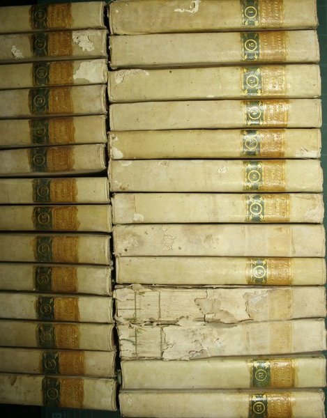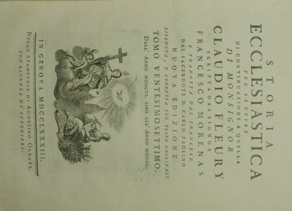 Di monsignor Claudio Fleury tradotta dal francese dal signor conte Gasparo Gozzi - Nuova edizione riveduta, e corretta sul testo originale - in 8° - pp.450 pp. ca. a volume - Piena pergamena, tasselli in pelle al dorso con titolo e fregi in oro - Ventisette volumi - Vignetta ai frontespizi, testatine e finalini - Tagli rossi. Frontespizio in rosso e nero al I vol., testo su due colonne - Qualche piccola mancanza ai dorsi e in particolare ai voll. VIII-X-XI e all'angolo superiore del vol. V - Dal XV vol. variazione del titolo: 'Storia ecclesiastica per servire di continuazione a quella di monsignor Claudio Fleury'. Vol. XXVII (ultimo): Storia ecclesiastica […] scritta dal signor Francesco Morenas e tradotta dal francese dal sacerdote D. Carlo Paolino
