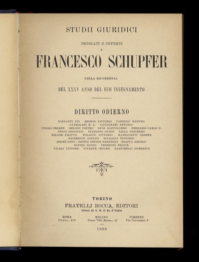 Studii giuridici dedicati e offerti a Francesco Schupfer nella ricorrenza del XXXV anno del suo insegnamento. Volume primo: Diritto romano. Volume secondo: Storia del diritto italiano. Volume terzo: Diritto odierno.