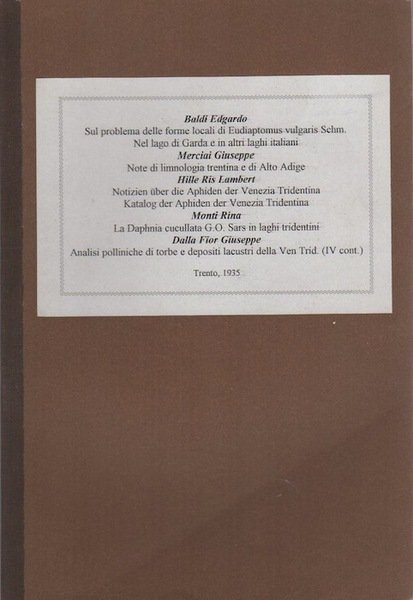 38 p., 30 cm, bross. Condizioni : USATO - Stato : Buono. Altre note : Legato con: "MERCIAI, Giuseppe. Note di limnologia trentina e dell'Alto Adige", "HILLE RIS, Lambert. Notizien über die Aphiden der Venezia Tridentina. Katalog der Aphiden der Venezia Tridentina", "MONTI, Rina. La Dpahnia cucullata G.O. Sars in laghi tridentini", "DALLA FIOR, Giuseppe. Analisi polliniche di torbe e dopositi lacustri della Ven. Trid. - IV parte".