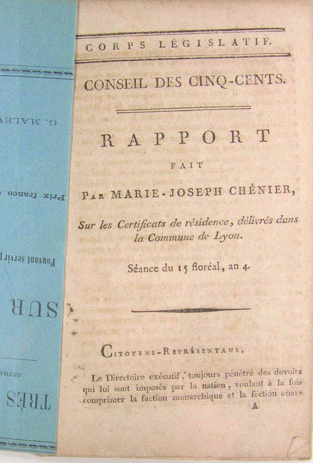 Corps législatif - Conseil des Cinq-cents, an IV, plaquette in/8, broché, couverture d'attente, 23 pages et 26 pages; précédé d'un Rapport du Corps législatif - Conseil des Cinq-cents fait par Marie-Joseph Chénier sur " les Certificats de résidence, délivrés dans la Commune de Lyon, séance du 15 floréal", an 4, plaquette de 6 pages.