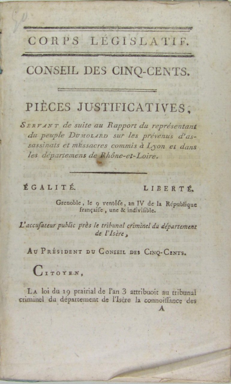 Sur les d'assassinats & massacres commis à Lyon & dans les départemens de Rhône & de Loire | Rare and modern books | Dumolard