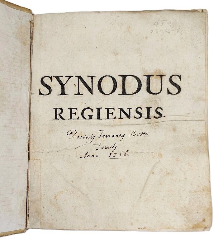 >in-4 (210 x 170 mm), pp. XVI, 393, con stemma vescovile del Conte Augusto Bellincino inciso in rame in antiporta. Legatura coeva in pergamena rigida con duplice riquadro di filetti, titolo ms. sul dorso a nervi. Corposa edizione originale dei Sinodi della diocesi di Reggio Emilia. Bell'esemplare.