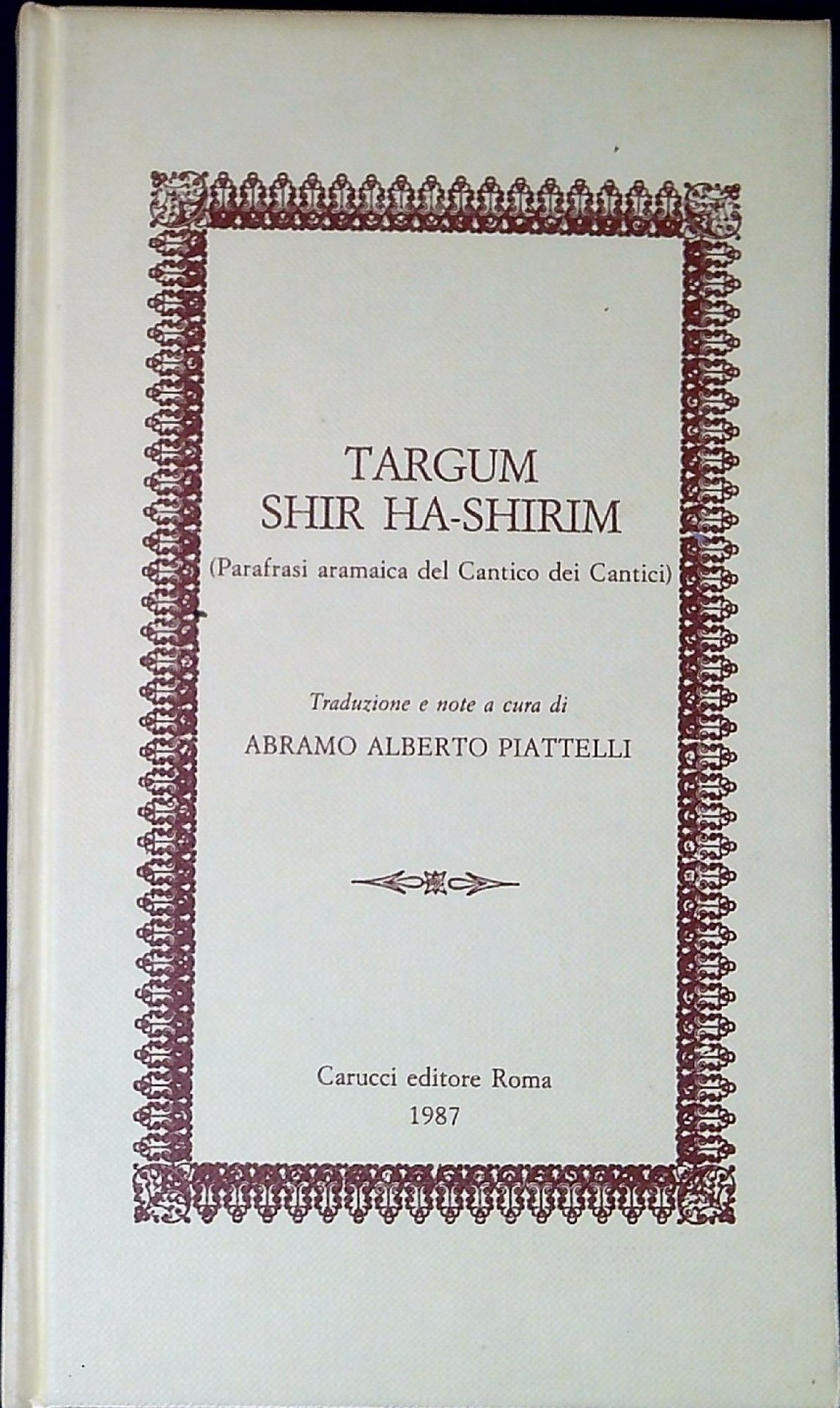 Piattelli, Abramo Alberto ( a cura di) Targum Shir Ha Shirim. (Parafrasi aramaica del cantico dei cantici). Roma, Carucci 1987, Collana di testi liturgici ebraici 3 88 p. (12746)