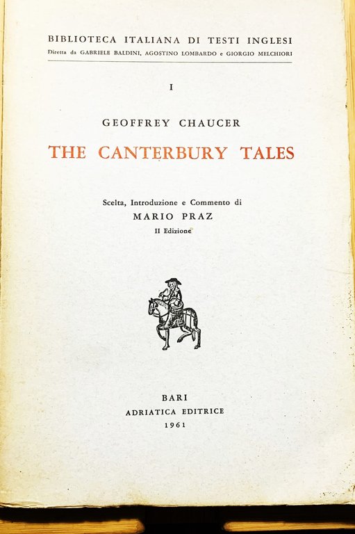 II ed. dell'antologia (ed. originale: 1387-8 ca. - I ed. dell'antologia: Bari, Adriatica Editrice 1957). Biblioteca italiana di testi inglesi diretta da Gabriele Baldini, Agostino Lombardo e Giorgio Melchiori, I. VIII/ 300/ brossura in cartoncino grigio-azzurro melange con titoli in nero e rosso. Stato buono (lieve usura della copertina ai margini - copertina e pagine brunite - appunti a margine e sottolineature a matita (tutti facilmente concellabili) nel testo in lingua originale). Indice: Vita di Chaucer - La cultura di Chaucer - L'influsso francese - L'influsso italiano (Bibliografia relativa all'influsso italiano) - I Racconti di Canterbury - La lingua di Chaucer - Appendice: Le fonti del "Book of Duchess") - Testo dei Canterbury Tales (The Prologue - The Prologe of the Wyves Tale of Bathe - The Wordes of the Hoost to the Frankelyn - The Prologe of the Frankeleyns Tale - The Frankeleyns Tale - The Wordes of the Hoost to the Pardoner - The Prologe of the Pardoners Tale - The Pardoners Tale) - Commento (Prologo - Prologo del Racconrto della Donna di Bath - Progo al Racconto dell'Allodiere - Le parole dell'Oste al Mercante d'indulgenze - Prologo del Mercandte d'indulgenze - Racconto del Mercante d'indulgenze).
