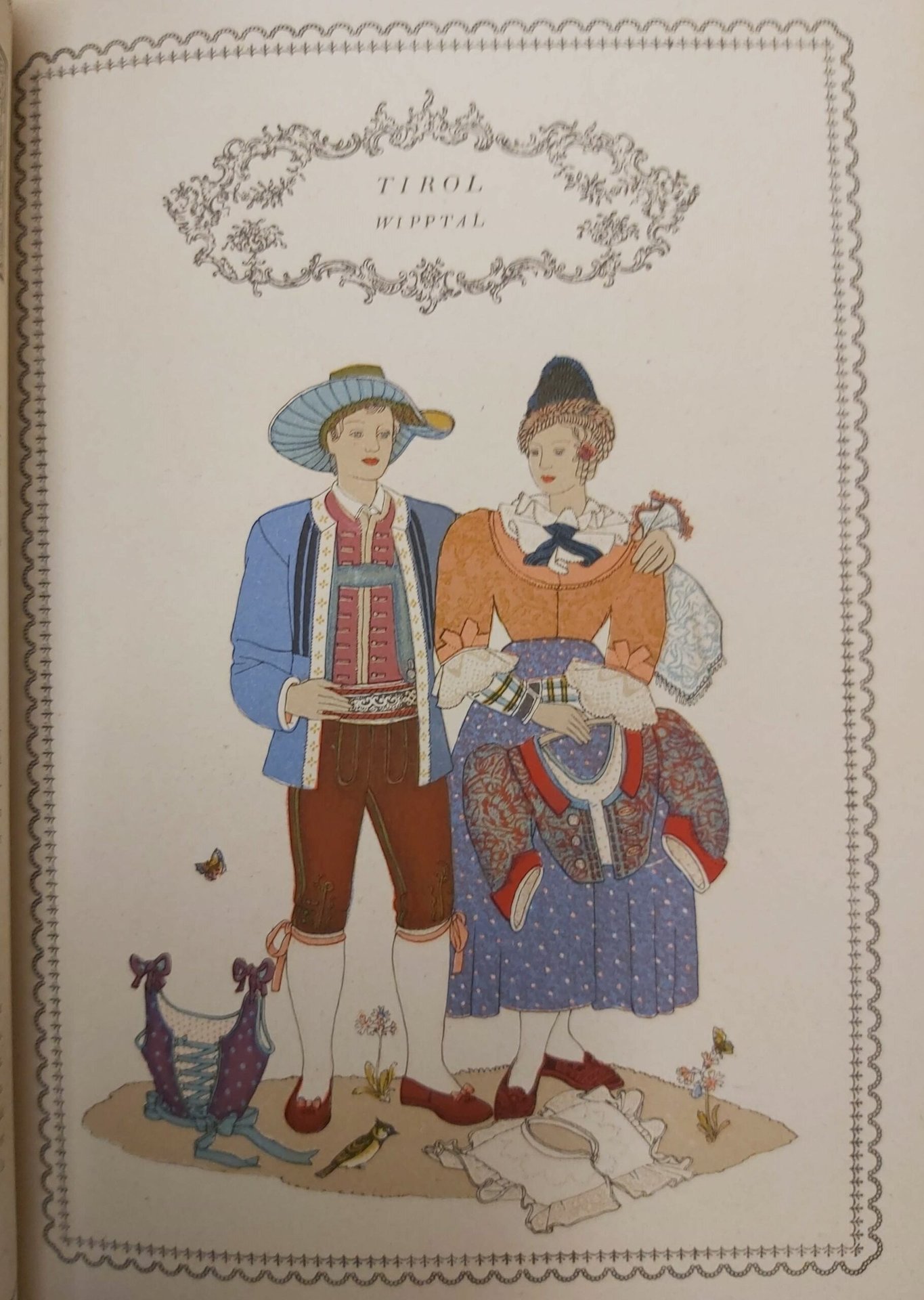 in-8, pp. (8), 60, bross. edit. con bella cop. a colori. Con 30 belle tavv. a colori raffiguranti costumi tipici tirolesi. [371]