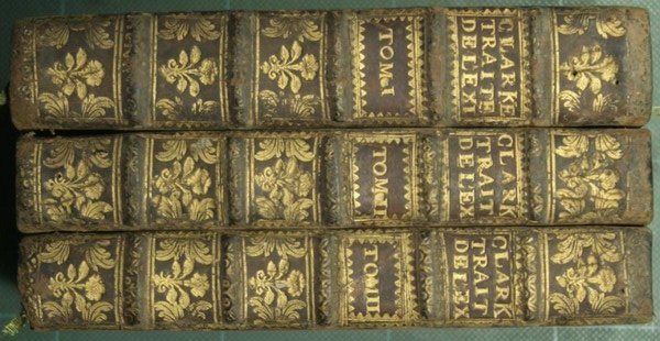 Des devoirs de la religion naturelle, et de la verite de la religion chretienne. Par M. Clarke Docteur en Theol. - Traduits de l'anglois par M. Ricotier. Seconde edition revue, corrigee, & augmentee sur la VI. Edition angloise - in 16° - pp.XLV + 13 cc. nn. + 332; 288; 294 + 9 cc. nn. - Pelle con titolo e fregi in oro al dorso - Tre volumi - Fregio ai frontespizi - Tagli rossi. Frontespizi in rosso e nero - Segni del tempo