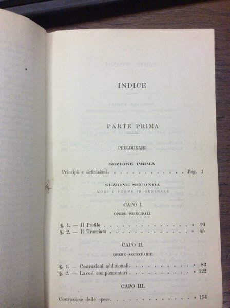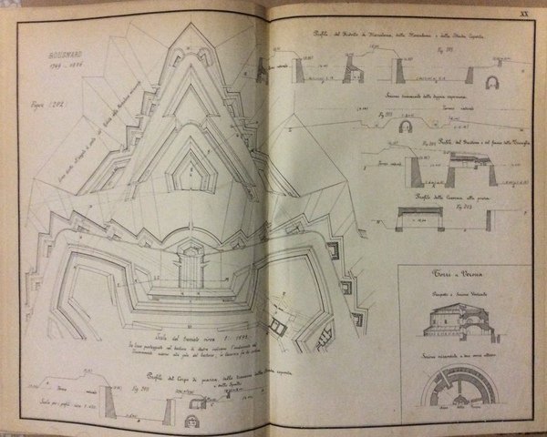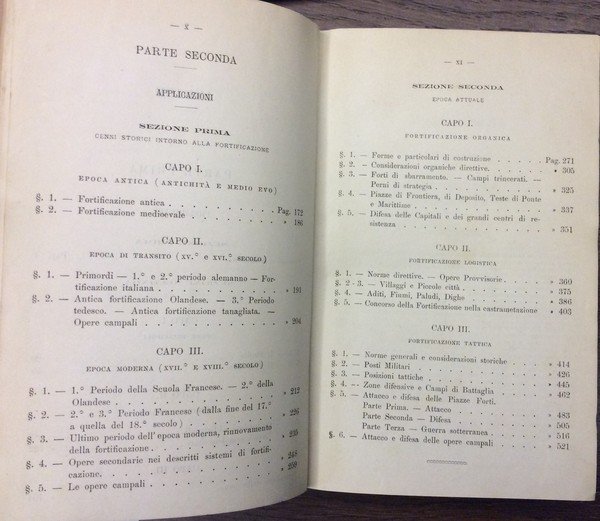 In-8 p. (mm. 211x126), 2 volumi (testo + Atlante), mz. pergamena coeva, titolo oro su tassello al dorso. Il testo, di pp. XI,536, è diviso in due parti: la prima tratta il Profilo. Il Tracciato. Costruzioni addizionali. Lavori complementari - la seconda Storia della fortificazione, dall'antichità e Medio Evo all'epoca moderna - Fortificazione organica, logistica e tattica. Il volume di Atlante, con mancanze ai piatti in cartonato (di mm. 310x215), contiene: frontespizio + 35 tavole a doppia pag. (la 28 è bis) con 316 figure incise su legno.Esemplare in buono stato di conservazione.