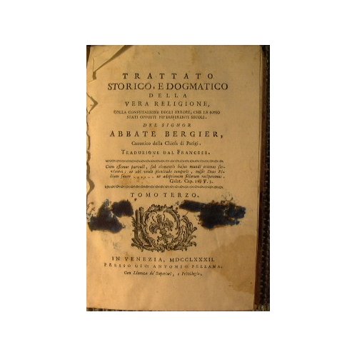 Del signor abbate Bergier Canonico della chiesa di Parigi - Traduzione dal francese. - in 16° - pp.448 - Mezza pergamena - Macchie d'inchiostro al frontespizio, pagine ossidate, mancanza della prima bianca - Opera scompleta: Tomo terzo