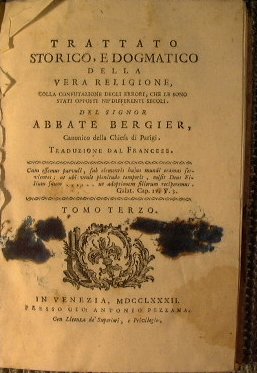 Trattato storico, e dogmatico della vera religione, colla confutazione degli errori, che le sono stati opposti ne'differenti secoli. | Rare and modern books | Bergier Nicolas Sylvestre