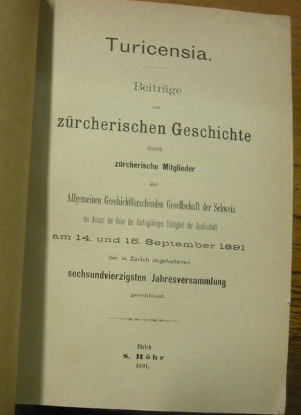 TURICENSIA. Beiträge zur zürcherischen Geschichte durch zürcherische Mitglieder der Allgemeinen Geschichtforschenden Gesellschaft der Schweiz bei Anlass der Feier der fünfzigjährigen Thätigkeit der Gesellschaft am 14. und 15. September 1891 der in Zürich abgehaltenen sechsundvierzigsten Jahresversammlung gewidmet. | Rare and modern books |